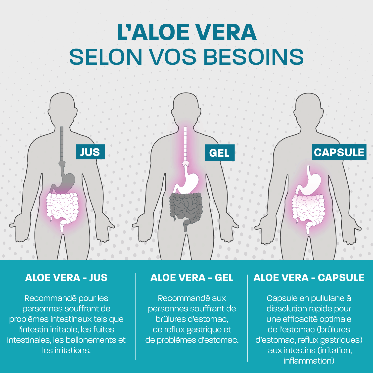 Quelle est la différence entre le jus d'aloe vera, le gel d'aloe vera buvable et les capsules ?